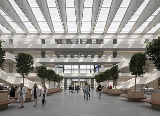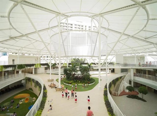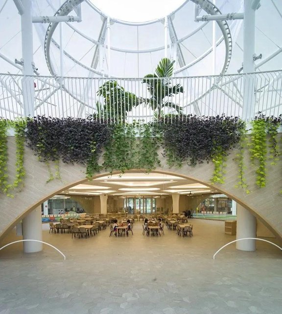 這個空間充滿了綠色。二樓畫廊和禮堂通過天頂自然采光,綠色植物使空間成為一個整體。園內采用色彩飽和度高的花盆,與室內軟裝形式融合,充滿了童趣。