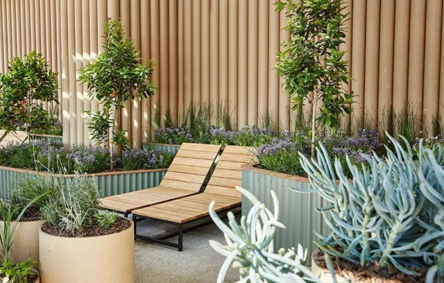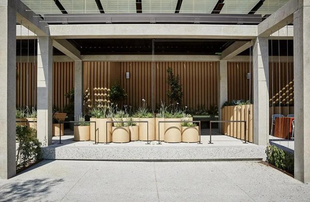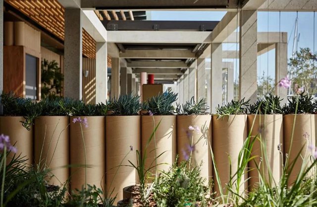 巧妙又簡潔的綠墻和系列植物組合造景,設置于大尺度的紙管中。設計靈感來源于海岸邊界線,由座椅、公共看臺和豐富的植物種植組合構成了一片起伏的景觀。
