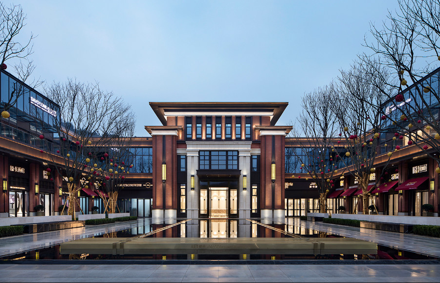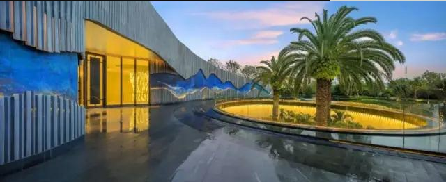 在地塊空間充裕的項目上,售樓處前場景觀區,一般都會配有儀式感較強的水景和長長的硬質路面,有些是中軸對稱設計,莊重感極強,也就是以“高位打擊”的方式,讓客戶產生仰視之感。