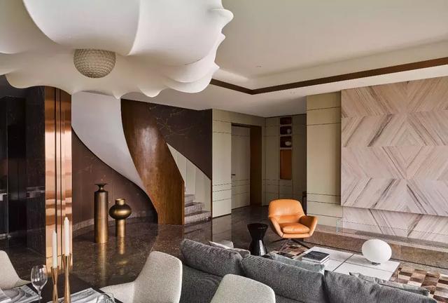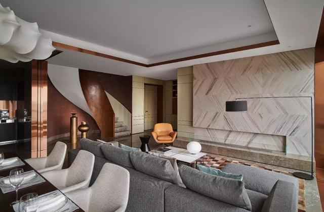 室內(nèi)通過石材、金屬、皮革等材質(zhì)的融合與對比,形成風(fēng)韻現(xiàn)代與優(yōu)雅古典的對話,渲染出國際大都會的俊朗風(fēng)度。客廳以對紋理手法打造背景墻,豐富視覺觀感;壁爐升騰,暖意回升。窗外,精致璀璨的都市圖景盡收眼底,坐臥之間,遠(yuǎn)觀近袛,皆融入城市的熱流。