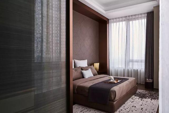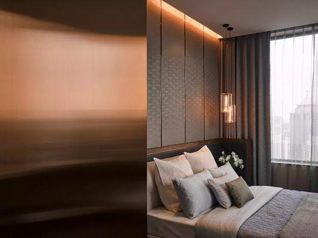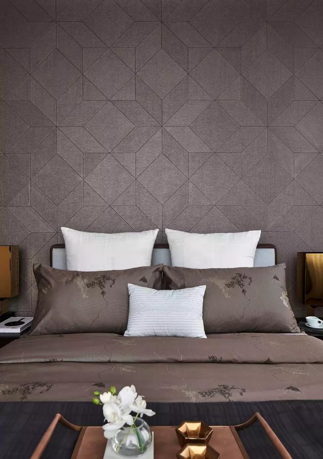 主臥采用塊面混搭來塑造空間,壁布硬包經(jīng)由U型內(nèi)凹金屬條的分割,一半濃烈、一半素雅,各具風(fēng)情。半包圍型床背由皮革嵌入木質(zhì),有效平衡立面視覺。