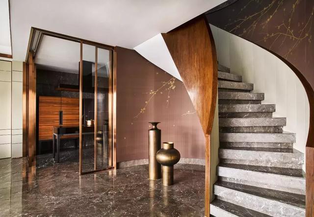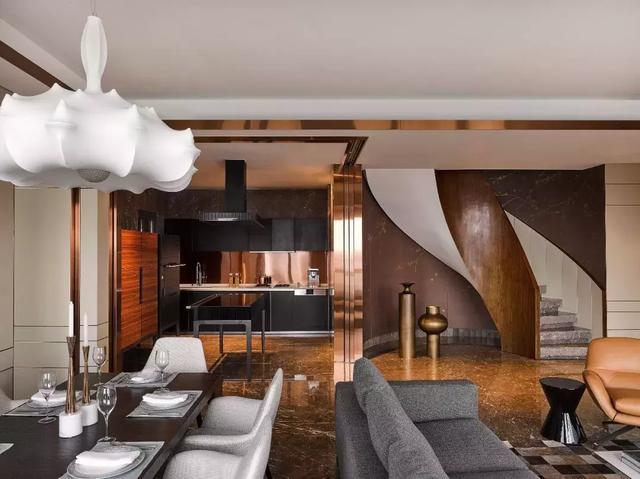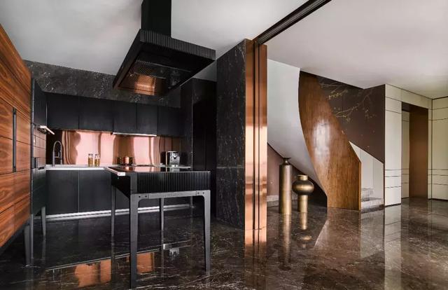 弧形樓梯蜿蜒而至,古銅擺件與立面手工壁紙自成一景。臺階拾級而上,將室內(nèi)與頂端露臺相連接,深色木材與皮革混搭,彰顯出對縫手法的魅力,讓情緒在不經(jīng)意間釋放。