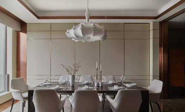 餐廳以高級灰皮革飾面鋪呈,金屬包邊精確分割布局,靜美的白色藝術(shù)吊燈柔和空間硬朗線條,花枝與燭臺裝點成趣,干凈疏朗的氛圍里彌漫著一絲浪漫情調(diào)。