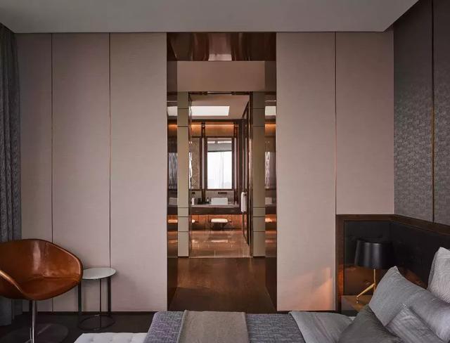 主臥套間內(nèi),十字動線交叉串聯(lián),強調(diào)功能、結(jié)構(gòu)、用材、形式的完整與延續(xù),實現(xiàn)無拘率性、干練利落的質(zhì)感表達(dá)。