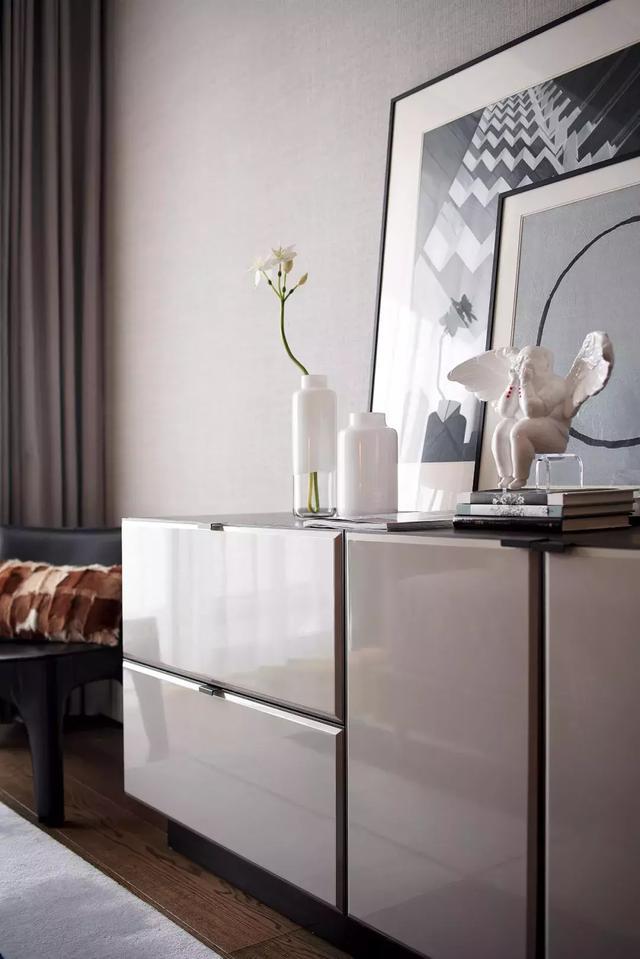次臥在淡雅的灰色調(diào)中釋放活力,透過一角的裝飾畫與擺件陳列,高低錯落的秩序間盡顯藝術(shù)氛圍。