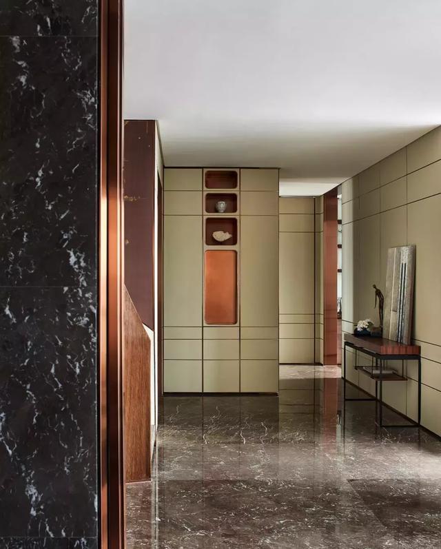 踏入玄關(guān),以縱橫交錯、疏密有序的線條引入整個空間的設(shè)計語匯,豎向大小不一的內(nèi)凹展示區(qū)細(xì)致勾畫出弧形邊框的美感,給予歸家的放松舒緩。