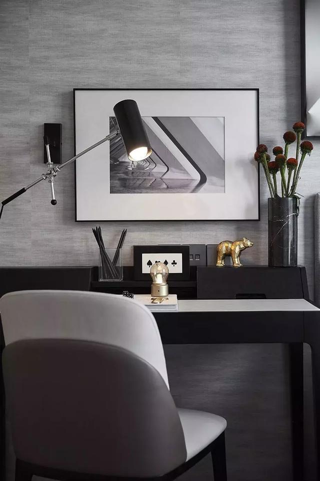 想要打造出高品質的感覺,必然要經過巧妙的色彩搭配,才能顯現出它豐富的內涵。色彩冷靜、線條簡單。在本案設計中,設計師充分選用了選用帶有高級感的中性色:黑白灰,演繹出一種“低調的奢華”,令空間質感更為飽滿。
