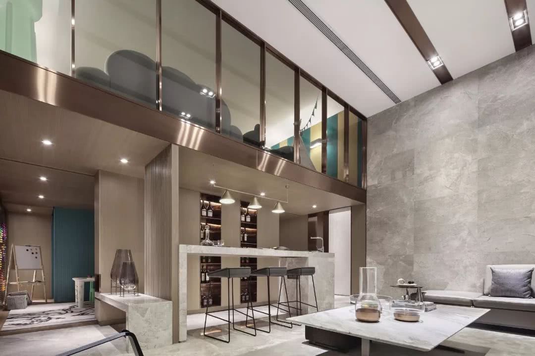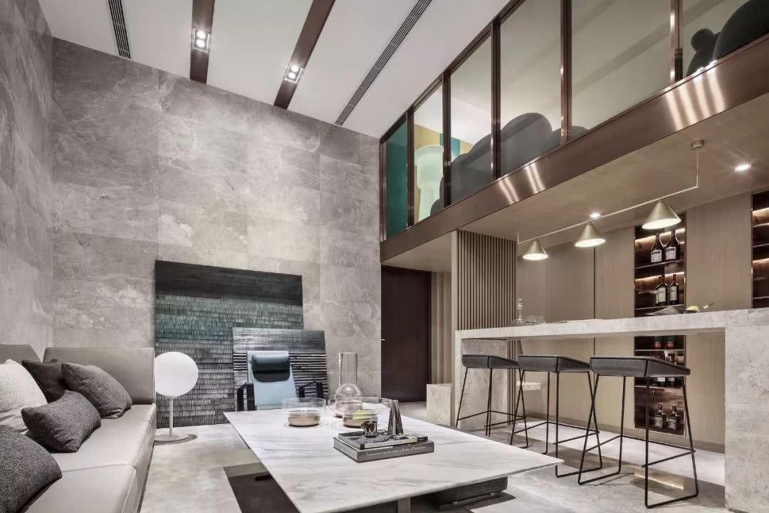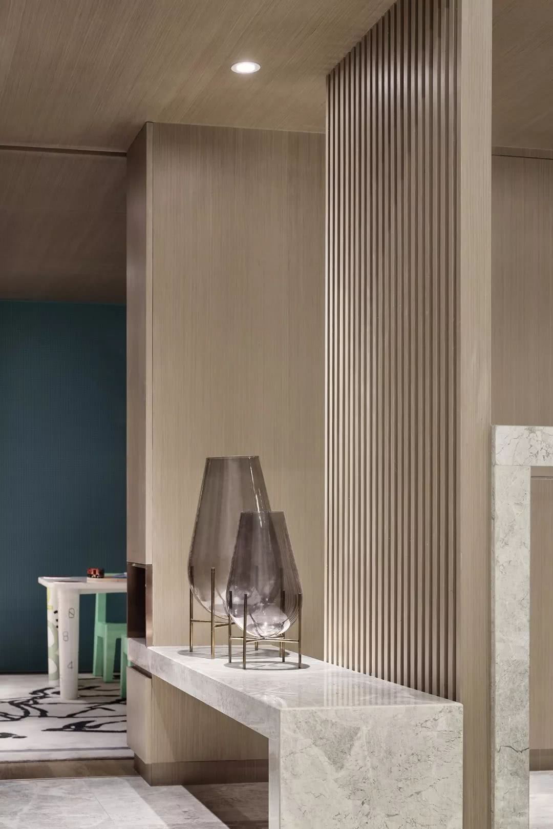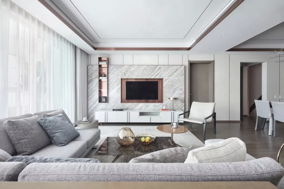 得益于落地窗為室內引入明亮光線,映襯出材質的自然肌理,鋪陳簡約現代的情景氛圍,為家人互動提供了理想場地。L型沙發后方設置書桌,創造客廳穩定面,勾勒整體主次關系。客廳兩端背景墻,演繹出金屬與石材、木飾面的碰撞,在體塊穿插間傳遞出生活的動態與平衡的哲學。