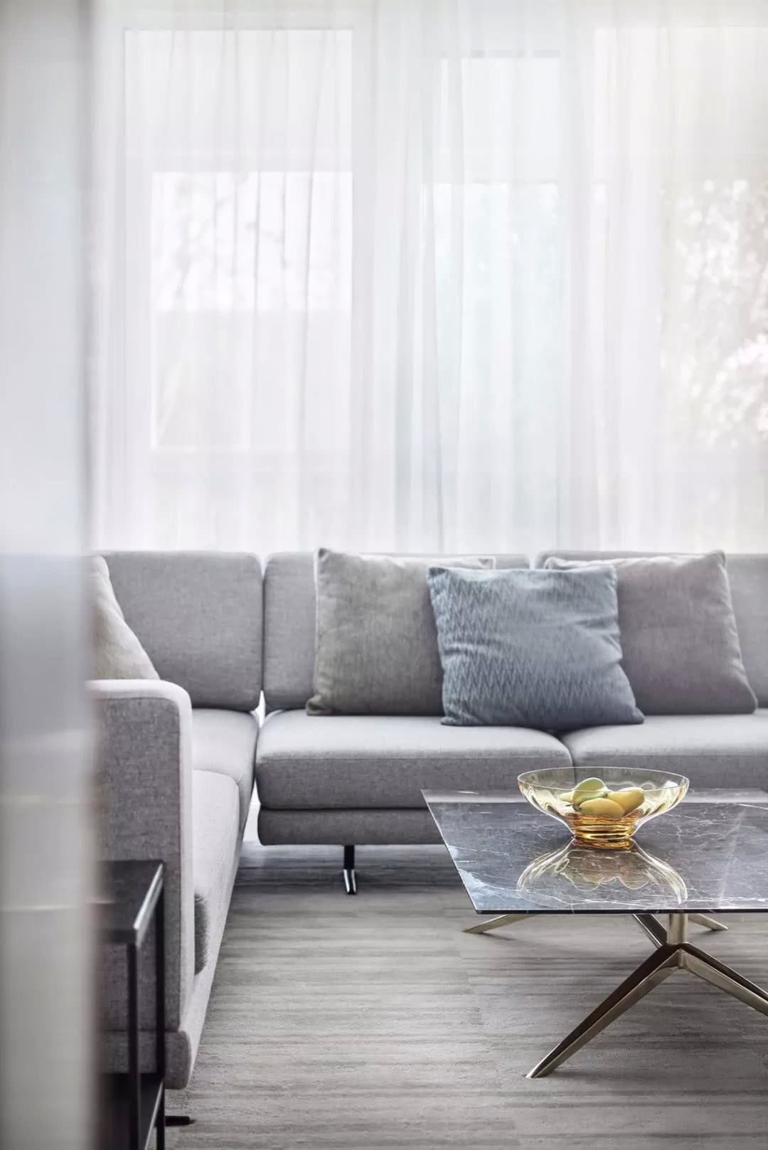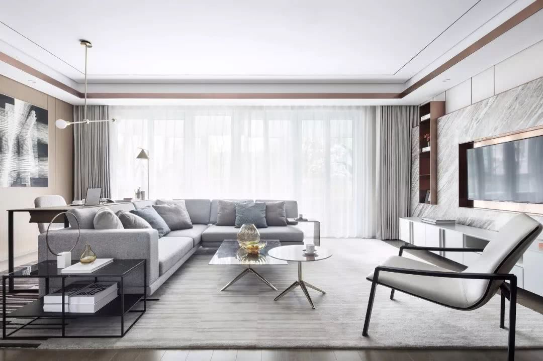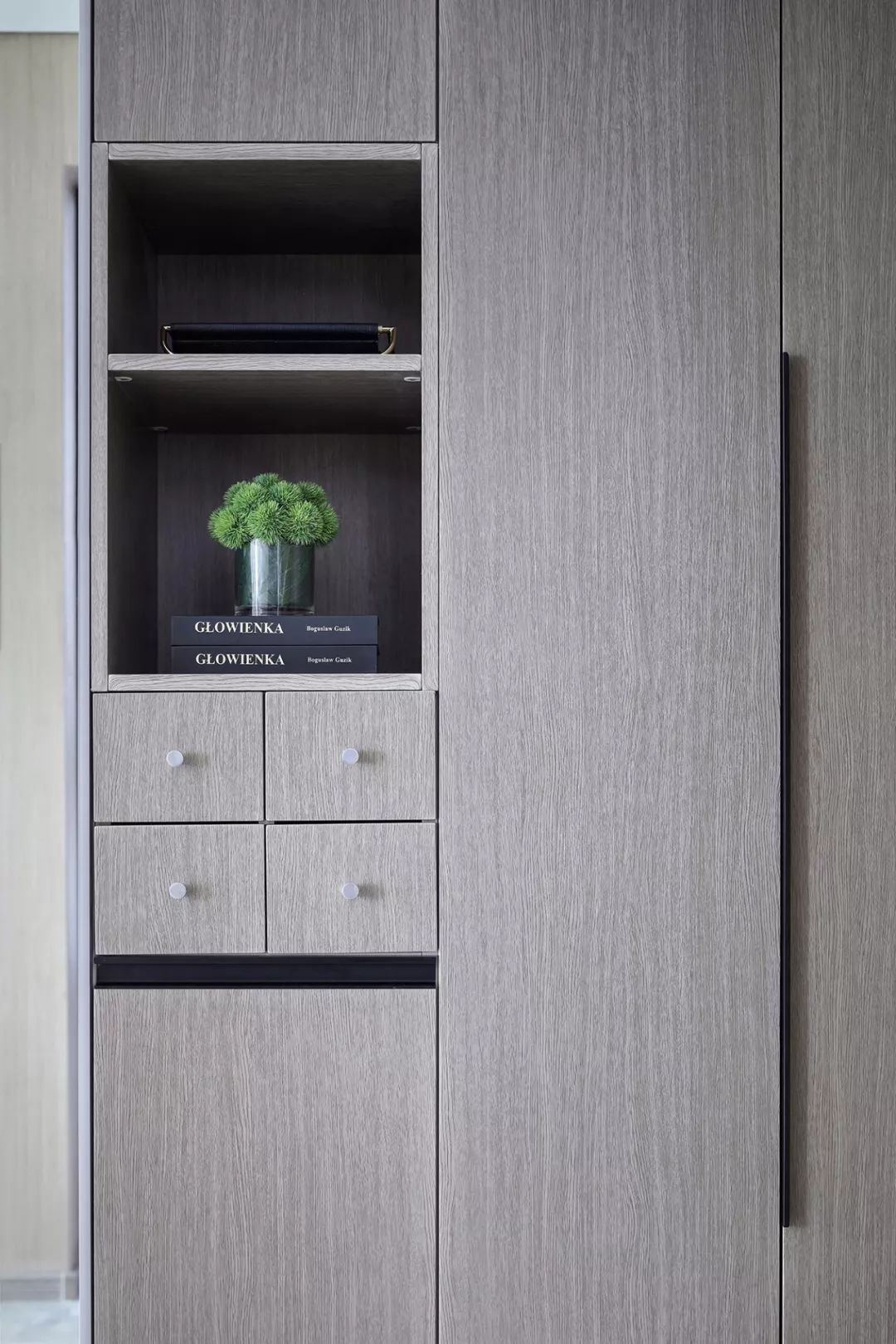 得益于落地窗為室內引入明亮光線,映襯出材質的自然肌理,鋪陳簡約現代的情景氛圍,為家人互動提供了理想場地。L型沙發后方設置書桌,創造客廳穩定面,勾勒整體主次關系。客廳兩端背景墻,演繹出金屬與石材、木飾面的碰撞,在體塊穿插間傳遞出生活的動態與平衡的哲學。