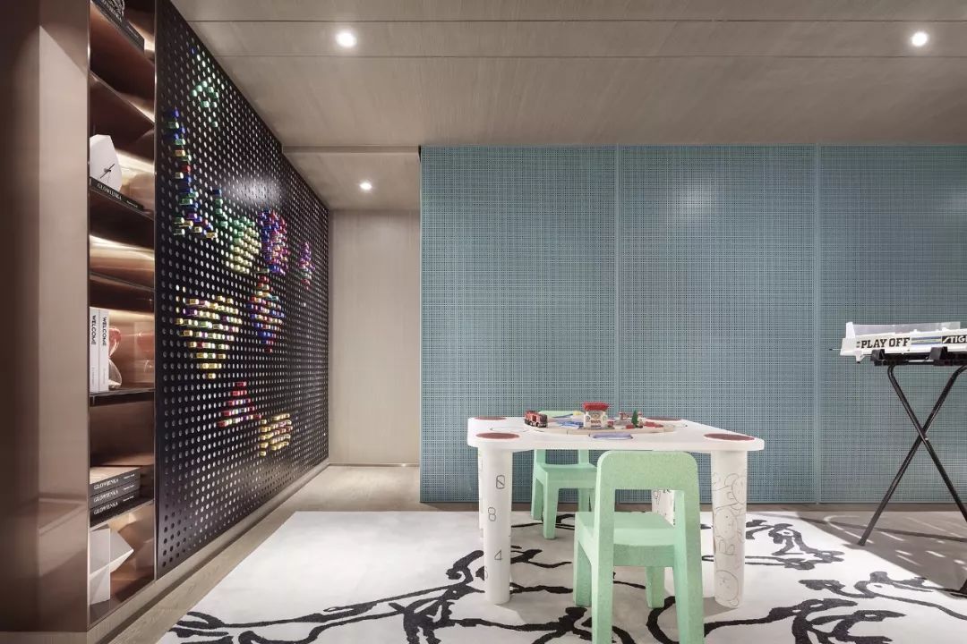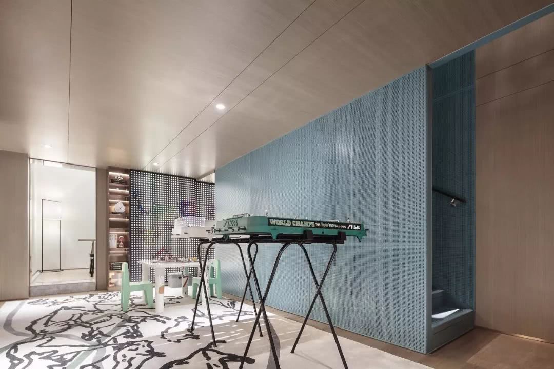 成人世界有著繁多的標準和功能,孩童游玩則是無拘無束的,因而在酒柜后側區域設置桌面足球、冰球等游樂裝置。最引人注目的五彩斑斕立面,為雙層黑色鋼板內打光定制打造,其中彩色亞克力可任憑靈感自由插放。藍色金屬沖孔板內藏樓梯,由此亦可進入同樣專屬孩童的夾層空間。