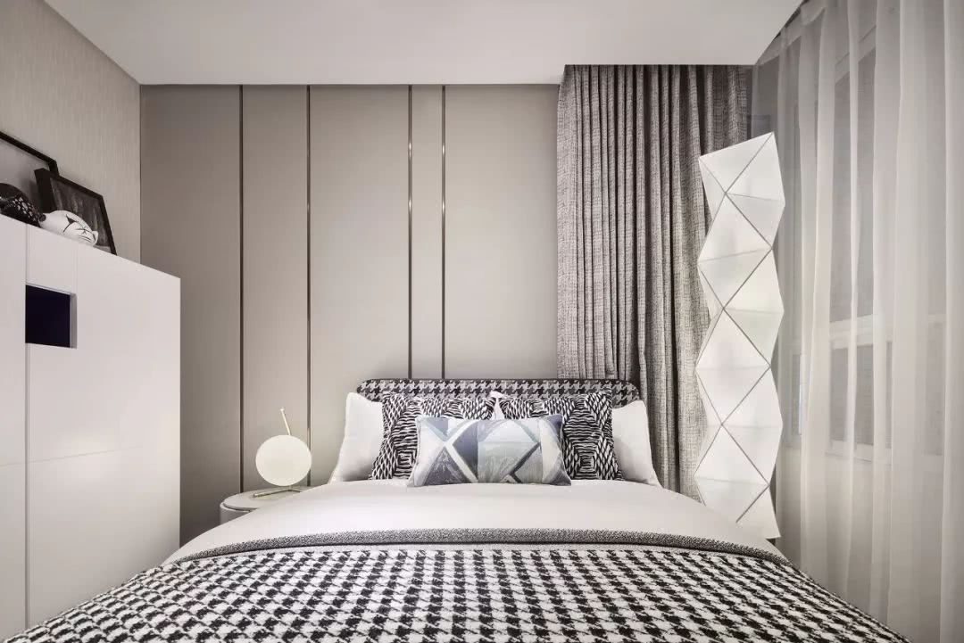 兒童房內L形窗體,千鳥格床品、印花糅合抱枕以及狹長紙燈,為這方空間增添了一絲俏皮與活潑,留駐夢幻奇想的童心時光,又極具個性豐盈的前衛格調。