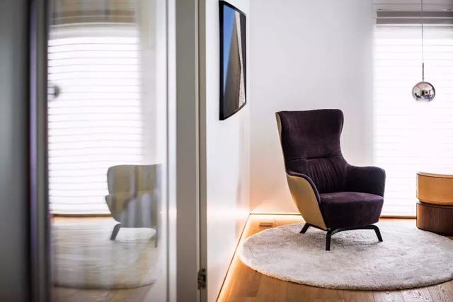 這種獨特,還存在于與視聽室貫通的客廳里。沙發被隨性的組合,沒有常規化的“3+2+1”搭配,而是處理的很有趣味感。或臥或坐,或隨意的趴在沙發墩子上,都是一種舒適的狀態。業主在這里看書聽歌,完全是一種輕松自由的模式。當木墻面向兩旁移動時,設計師在其背后藏著一整套高級視聽系統,家主人獨自享受一部電影或約三五好友的家庭聚會都相當愜意。