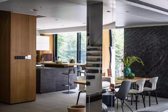 由家具來定義聚合,整個底層沒有硬性分隔,卻變成了一整個大型的“活動”空間。一個實木臺面與大理石基座拼合的島臺,配上幾把高腳餐椅,再加上一整塊天然原木的餐桌和純牛皮餐椅,就是放松的餐廚空間;圓形茶幾、柔軟沙發、絲絨地毯,圍攏出舒服的灰色調客廳。