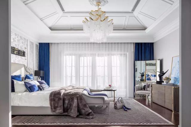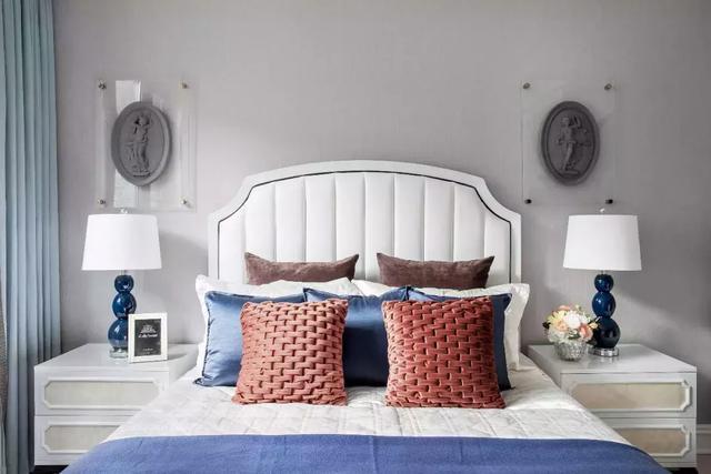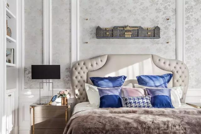主臥以高級灰色占主調,樸素典雅的壁紙使得空間通透明亮同時也更顯精致華貴。奶油色皮質床頭配以藍色床品點綴,又為空間注入舒適溫馨的氛圍,讓心靈遠離都市的喧嘩,進入忘我的境界,讓生活每時每刻回歸經典。