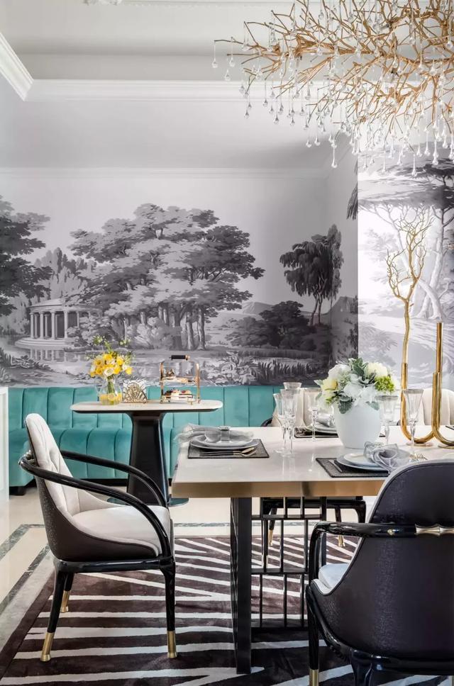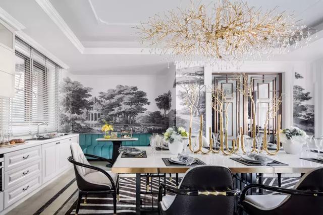 實用性之上兼具美觀,餐廳是家居生活的心臟。完全開放式的客廳餐廳,使得空間通透舒展。色彩上延用客廳的搭配形式,法式園林壁紙圍繞空間展開敘事,現代感強烈的餐桌餐椅,襯以貴氣的金屬鑲邊,是古與金的碰撞。