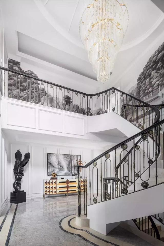 這種在美學上的深刻共鳴,成為打造本案的切入點。為營造一個蘊含文化氣息的雅致空間,設計師以尊貴穩重的石材鋪陳地坪,樸素精致的壁紙裝飾墻面,鐵藝旋轉樓梯扶手穿插其中,在整個場域入口處,奠定空間基調。