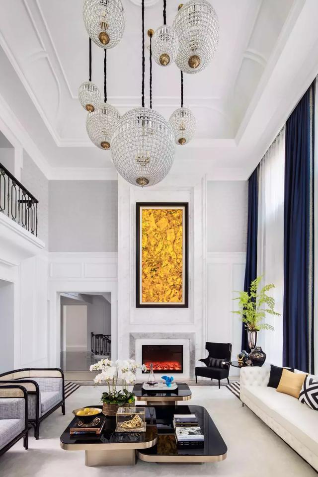 步入客廳,偌大的挑空空間,家具以圍合的形式相聚,意為圓滿、方正。整個空間以三面落地窗環抱,與室外景致無縫相接。高低錯落的吊燈,增加挑空的靈動性。黑白灰為基色,藍金相輔相成活躍其中。