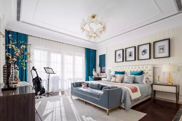 女兒房精致石膏線與水晶吊燈的組合,充分展現空間的層次美感。亮色壁紙、地毯,搭配復古孔雀藍軟裝,考究的黑胡桃木沉淀了浮華,隨著光線強弱的變化,呈現出耐人尋味的空間韻律。