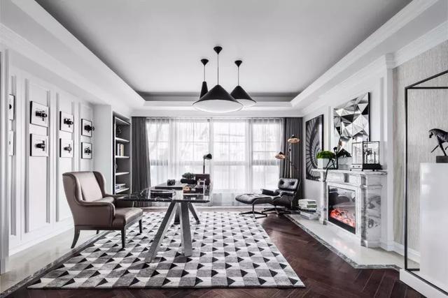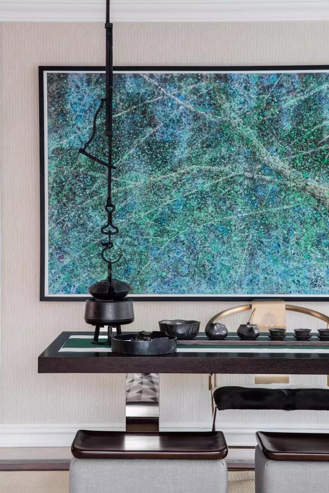 負一層被打造為男主人書房和地下茶室,是為實現最優布局。黑、白、灰構成的書房,為喧囂中安靜一隅,使人置身其中,恍若隔世。茶室靜謐幽清,悟禪解意,感受繁華都市內難覓的安寧和歷久彌新的氣韻,不突兀、不違和,仿佛天生就該同俱一體。