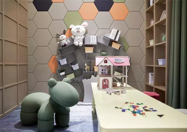 沙盤區(qū)上方懸掛的藝術吊飾,造型簡約靈動,高低垂掛半空,凌亂中錯落有序,與序列感十足的背景造型兼具連貫性且形成呼應,營造出該空間的跳躍簡潔,靈氣十足。