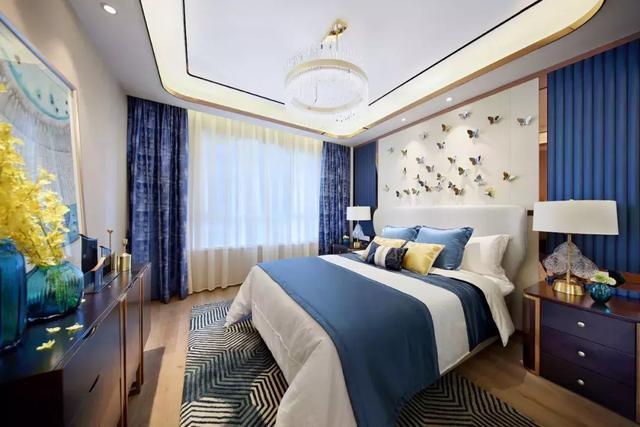 臥室床頭翩翩欲飛的蝴蝶,搭配藍白色調床品,讓人與大自然更加親近。