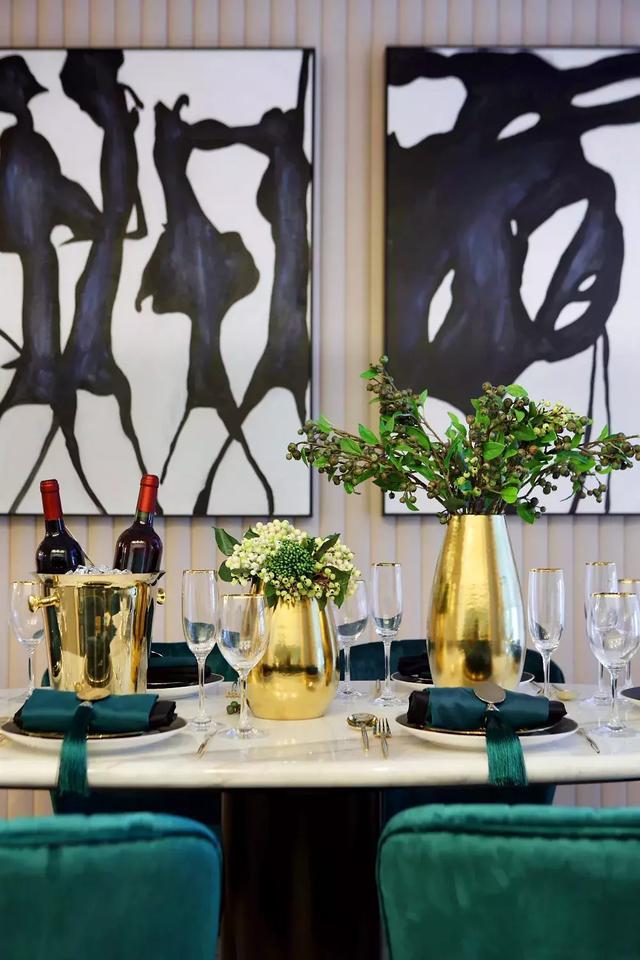 富有韻味的天鵝絨餐椅與金屬元素加以調和,極致的奢華魅力更是無法抵擋。