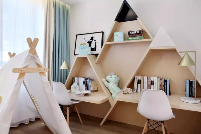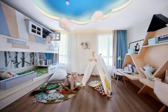 天真爛漫的色彩、輕飄的云朵吊燈、散落一地的抱枕和搖擺馬兒流露出獨特童趣,具有私密性的小帳篷許小小人兒一個幻想空間。