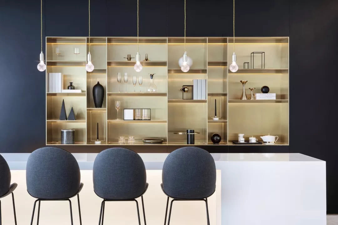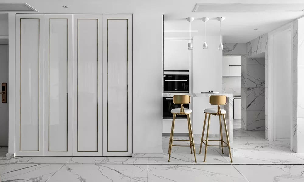 黃銅和大理石是現(xiàn)在最熱門的輕奢元素,黃銅的高級質(zhì)感搭配大理石的溫潤含蓄,在視覺上可以形成一股極強(qiáng)的藝術(shù)張力,輕松打造一個(gè)時(shí)尚雅致的現(xiàn)代家居環(huán)境。使用有弧度的裝飾,可以使空間具有藝術(shù)感和更加闊。