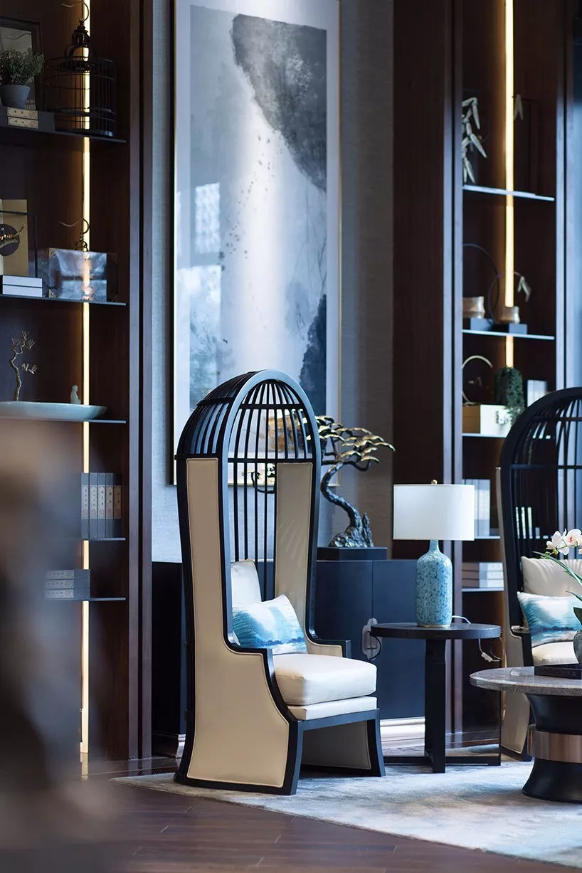 誘人的藍調展現著深遠的意蘊。將藍色與新中式結合,旨在打造典雅高貴的美韻。它的搭配要點在于:保留木紋肌理的天然質感與自然屬性和以黑白色調、簡約造型的方式呈現,可以更為巧妙地突出主題及需求。