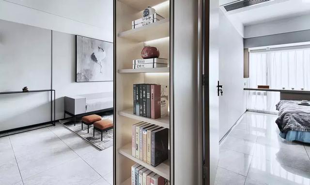 在過道邊上設計了一排書架,放少許書本讓空間有少許書香味。