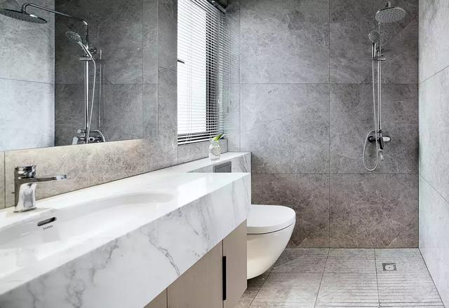衛(wèi)生間做了壁掛馬桶,臺面用大理石與洗手臺齊平,有足夠臺面放東西,洗手臺柜也做懸空設計,害怕柜子受潮,女兒還小,現(xiàn)在都是用盆兩個人幫忙給她沖涼,所以淋浴用軟簾,這樣空間會大一點。