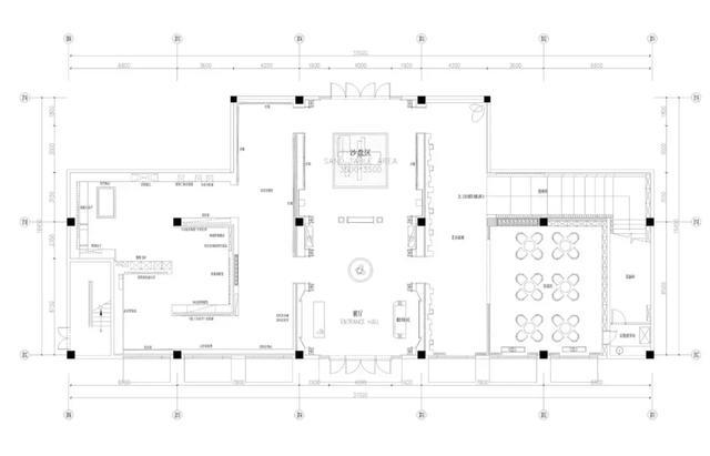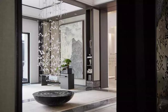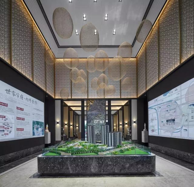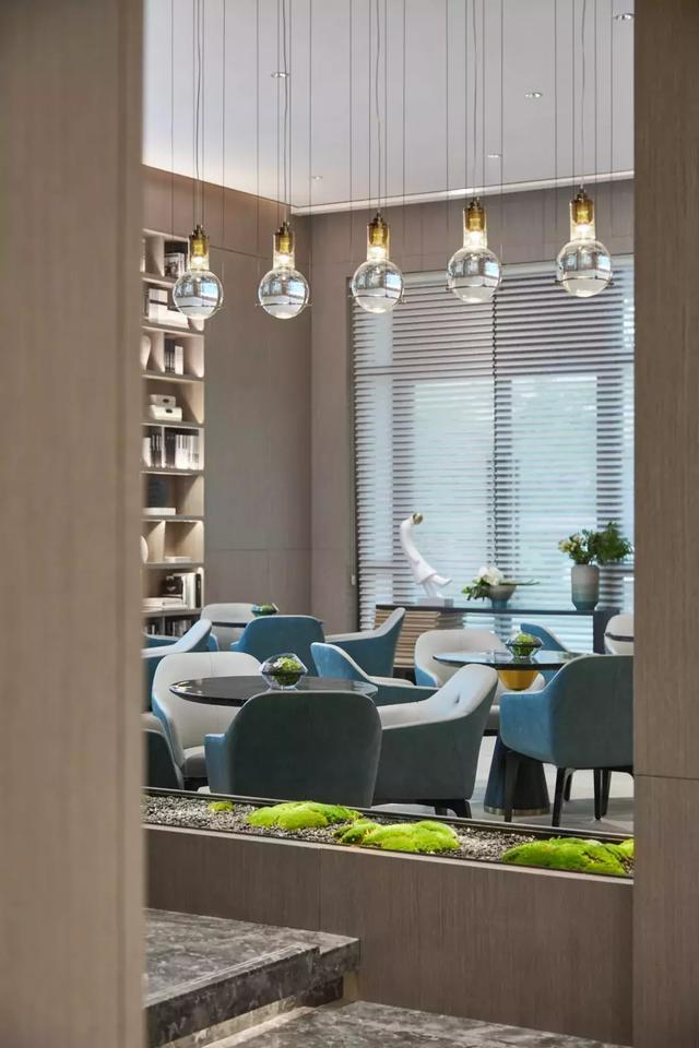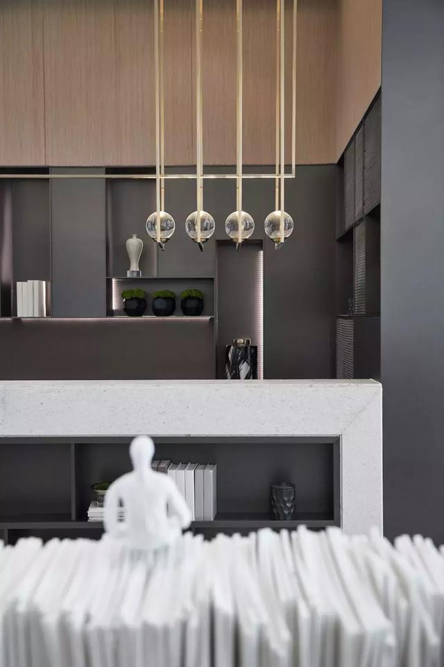 平衡對(duì)稱的布局銜接大廳、沙盤區(qū)與接待區(qū),在整個(gè)空間中,設(shè)計(jì)師將傳統(tǒng)與現(xiàn)代的界限模糊化,卻各自保留其精致奢美的質(zhì)感,融而不斷,形成空間的通透性,呈現(xiàn)虛實(shí)相間的效果。