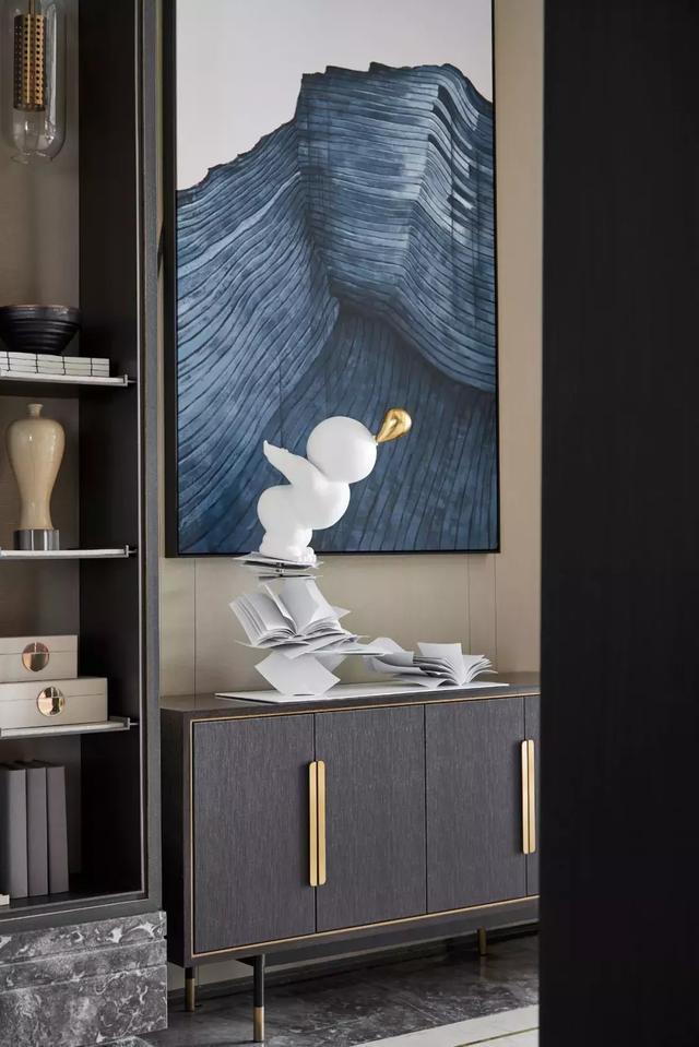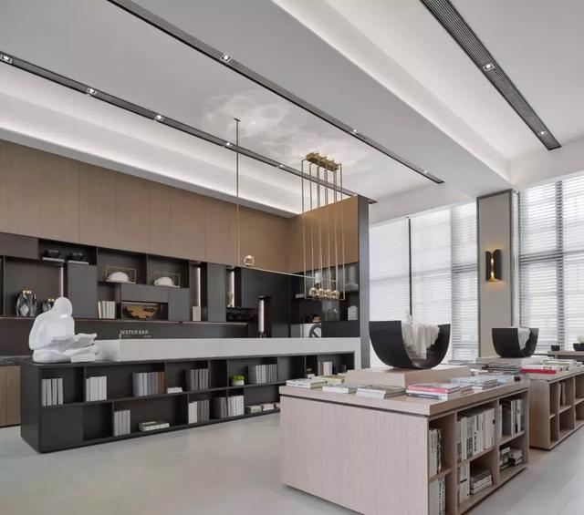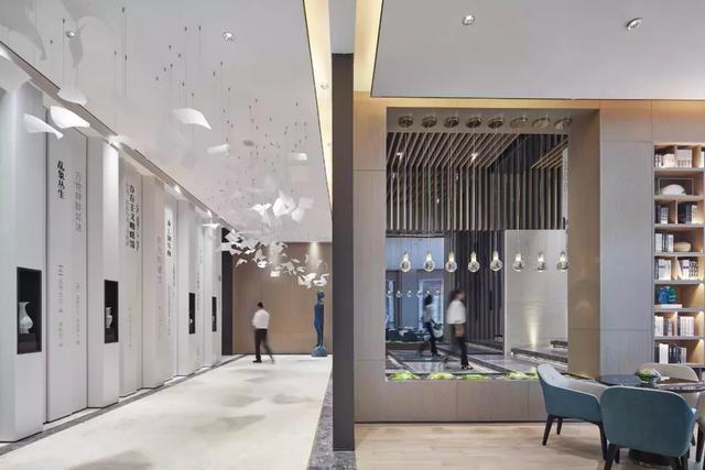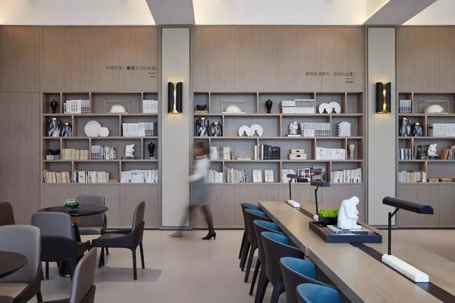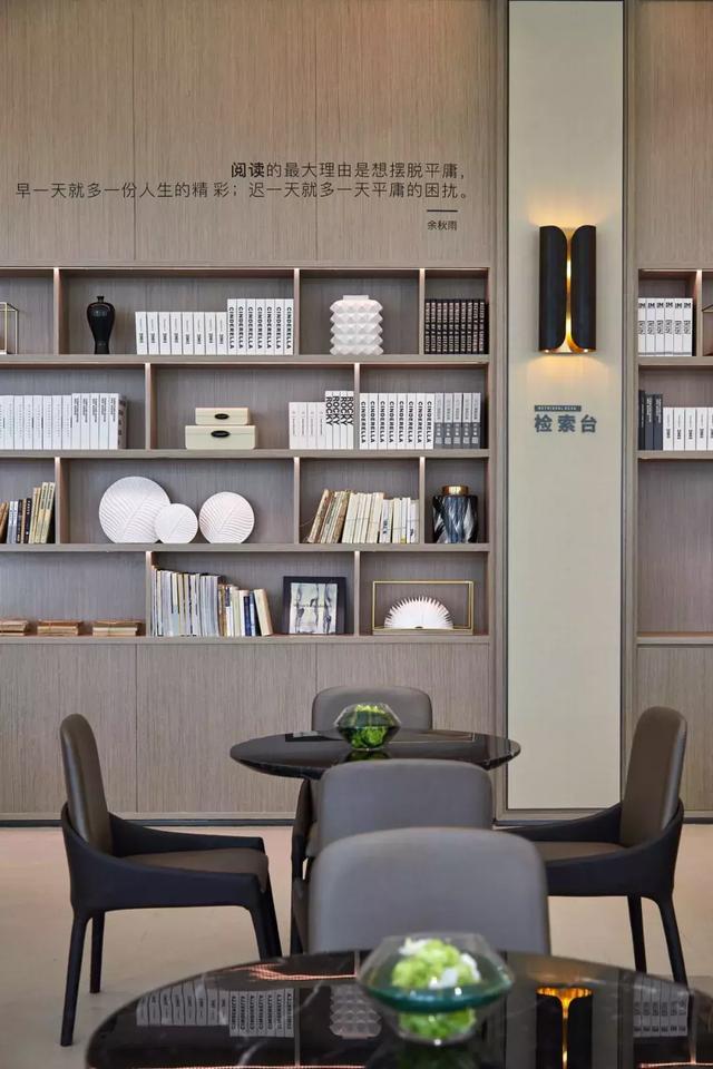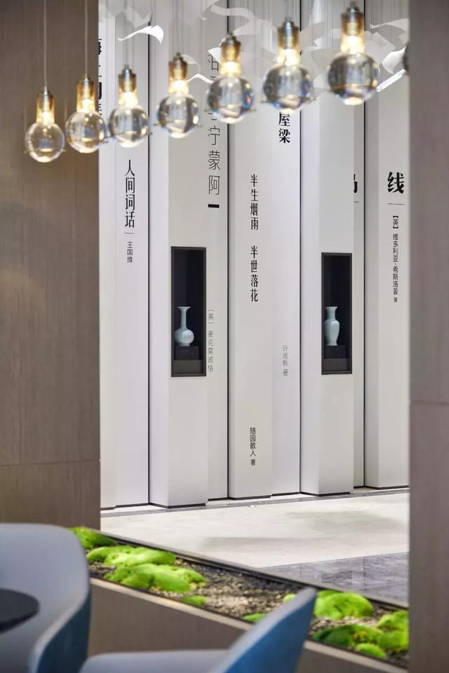 設(shè)計(jì)師通過對(duì)空間設(shè)計(jì)的升級(jí),為這個(gè)售樓處打造了一個(gè)具有辨識(shí)度的藝術(shù)長(zhǎng)廊,高三米八的書墻,以夸張的表現(xiàn)手法,營(yíng)造出素雅靜逸的書苑氛圍。于書墻中嵌入裝飾柜,放置的白瓷花瓶,卻有“書中自有顏如玉”的既視感。