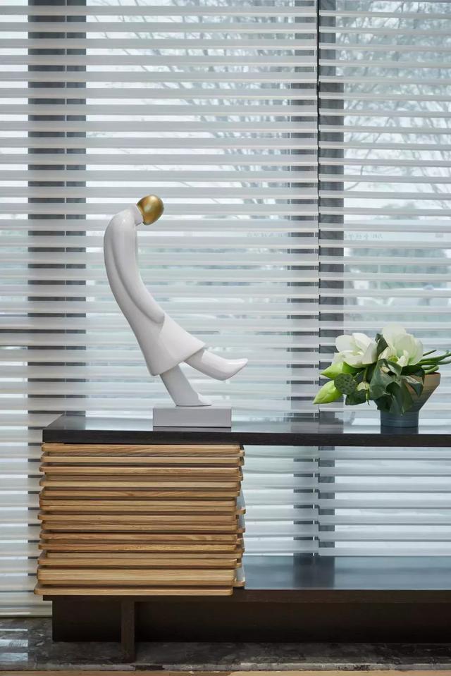 沿著樓梯,層層疊巒的書簽“鑲嵌”在木格柵上,順序而上,與藝術(shù)長(zhǎng)廊的書墻呼應(yīng)得當(dāng),強(qiáng)化了整個(gè)空間的意境。閉目的雕像似乎在傾聽內(nèi)心的聲音,再華麗的粉飾都無法將這一純粹的空間“情境”營(yíng)造出來——平靜,和諧與秩序。
