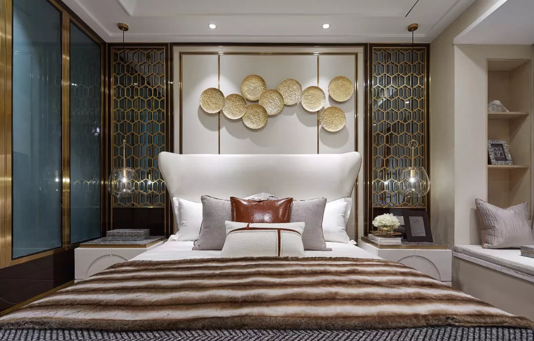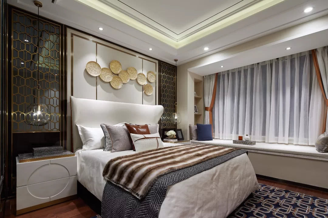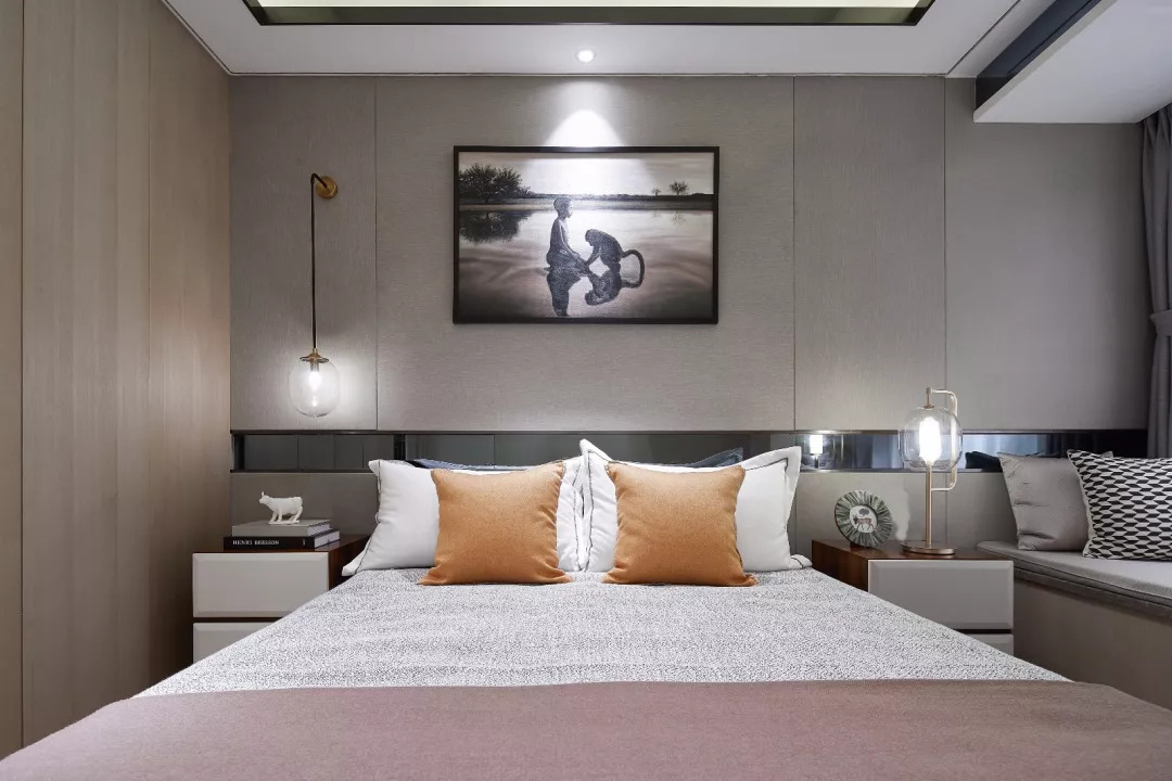 主臥以一個精致、雅奢、從容的生活方式為空間主題,提取自然及生活中的新東方美學元素,構筑出藝術氤氳的舒適空間。