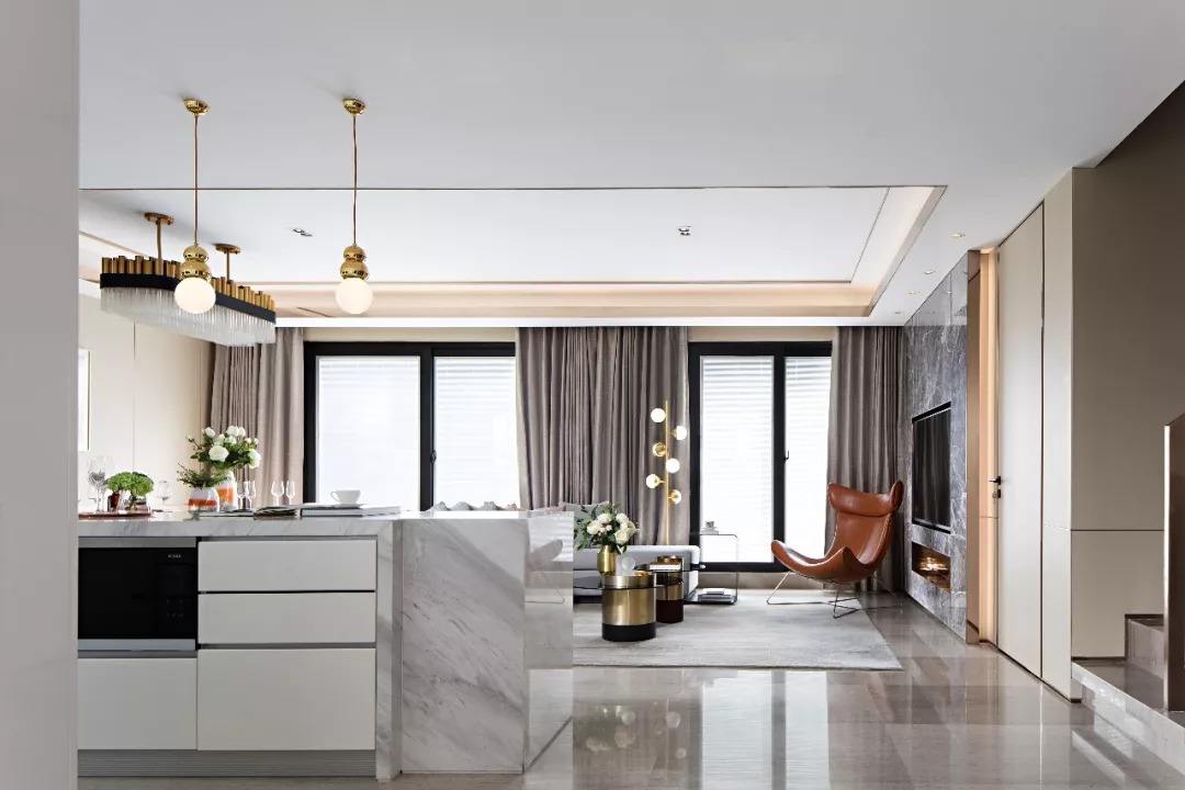 廚房、客餐廳互聯開敞,以三折階梯式對應劃分功能區,塑造虛實格局。客廳一側以純白懸浮柜體內嵌黑色置物架,構成別樣一景;另一側利用金屬黑鈦分割的木飾面電視背景墻,搭配石材穿插手法打造而成的底座,立體感十足。