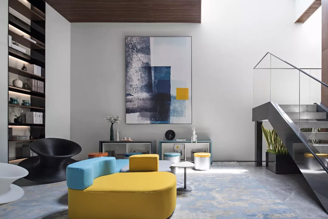親子主題的地下層,木飾面與米色壁布,營造出休閑氛圍。歡快的藍黃亮色家私裝點,寥寥幾筆便構成了一個曼妙的兒童嬉戲之境。