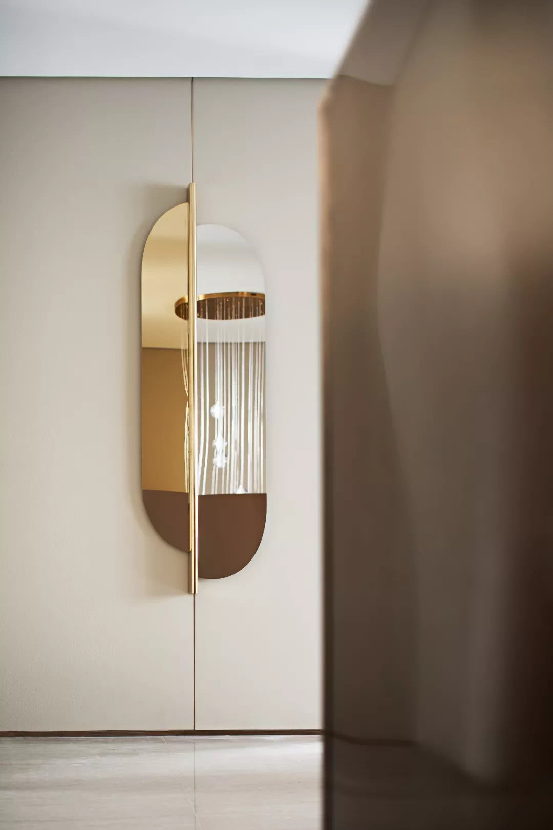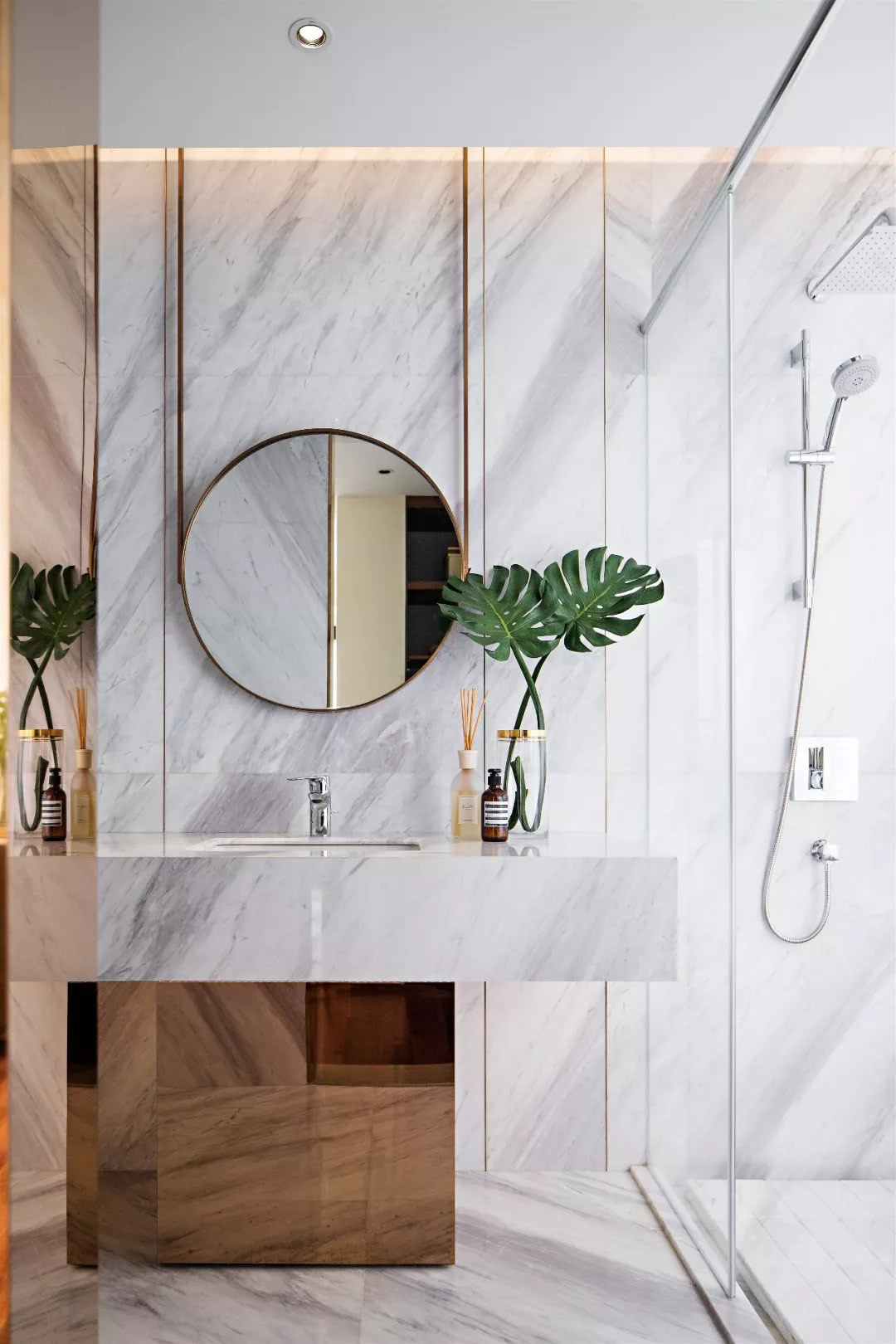 主衛臺盆造型運用形體穿插手法,定制的懸掛鏡體凸顯輕盈之態,方與圓的幾何線條勾勒出空間平靜柔和的一面。