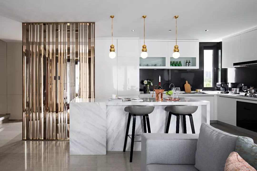 入口玄關處安放可移動金屬格柵,隔而不斷,又在一定程度上確保私密性。室內通過開放交融式設計,讓廚房、島臺與客餐廳連通,提升空間開闊度,也是對現代生活方式的回歸與重塑。