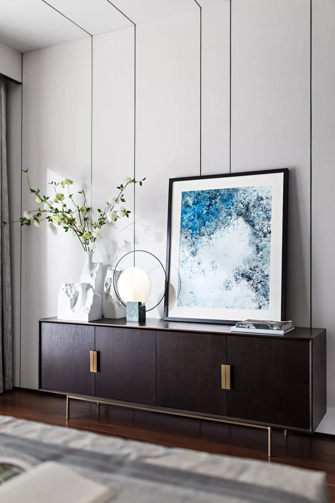 次臥黑白撞色的壁畫,柔和清雅的地毯和儲物柜,怡然自在的體驗撲面而來。
