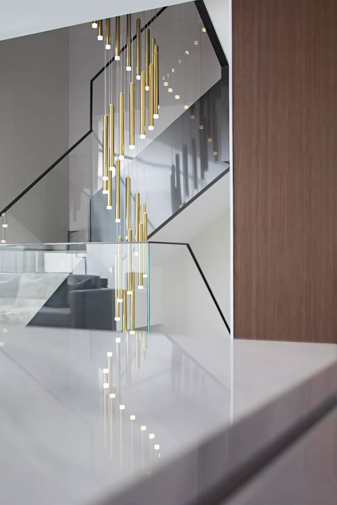 樓梯扶手處的整塊透明玻璃,采用1cm金屬不銹鋼包邊,展現其精致的細節和獨特的工藝。同時搭配旋轉狀吊燈,進一步提升這一隅的飄逸感。
