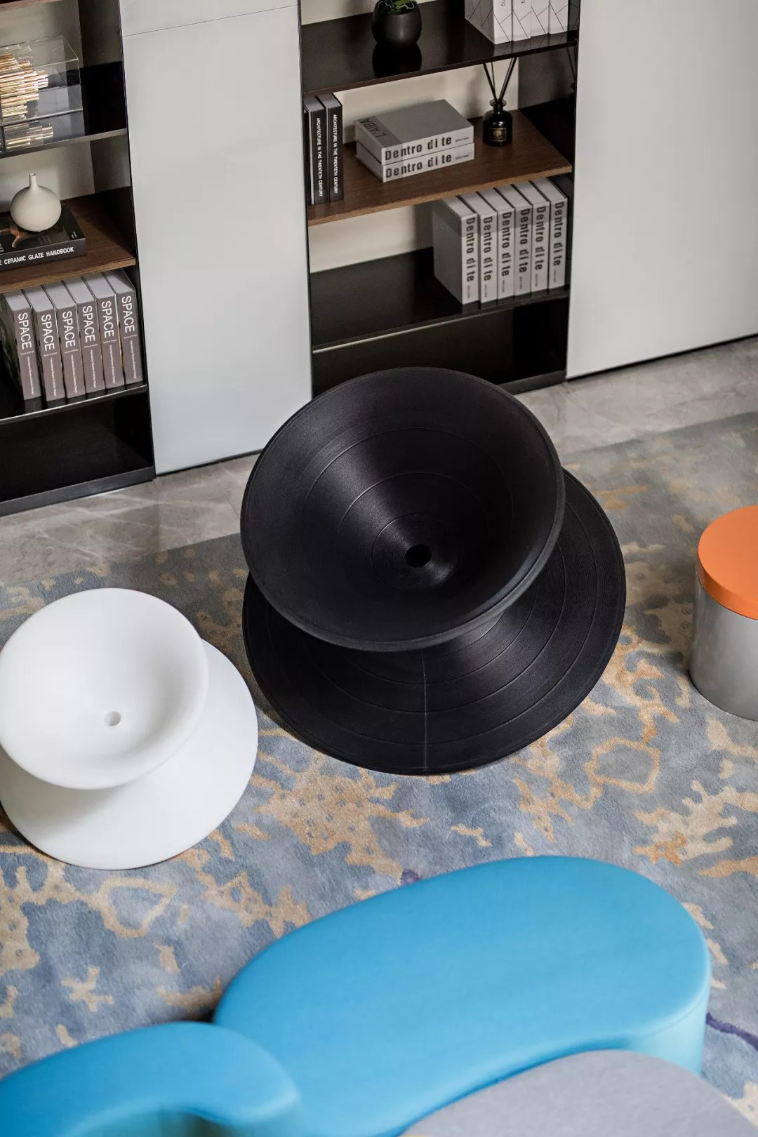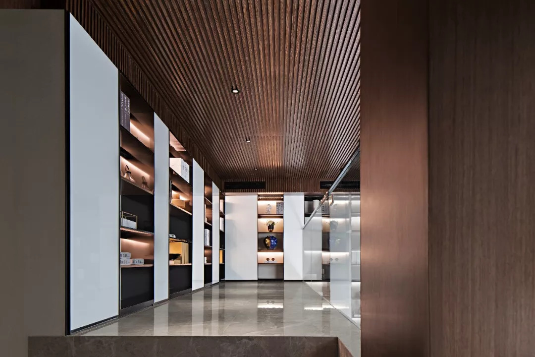 探入夾層,是一處類似圖書館的場景設計。每件物品似是穿墻而出,書架層板內光影變化和頂部格柵的序列感給人強烈的視覺沖擊。大膽創意的巧思由最下層延續至此,上下兩部分以黑色塊區隔,同時在顏色和塊面形式上承接呼應。