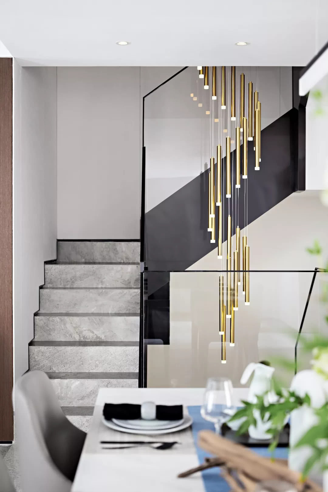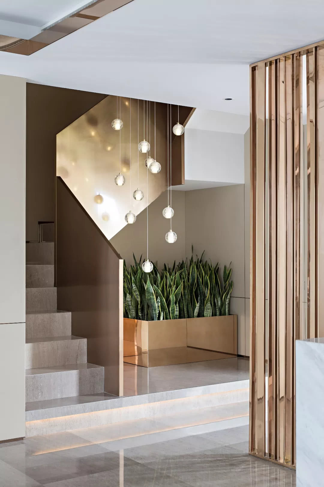 精致的細節雕刻出樓梯間硬朗的建筑形態,組合吊燈隨性散落,盡顯柔情與細膩。陽光灑入,綠植綻放生機,一切都是如此的舒暢與愜意。