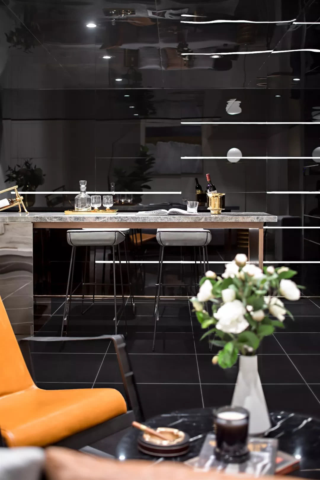 轉至地下室,有效整合高挑空形式,借助夾層分隔設置,實現地下雙層空間,打造洽談區、品酒區、影音室等活動空間,滿足多樣功能區的需求。由樓梯入口遞進而入,多種不同元素又構成震撼反差。鏡面不銹鋼、金屬沖孔板與石材混搭,再融入不同的光韻,交相映射出層巒疊嶂的魔幻色彩,極其動感酷炫。
