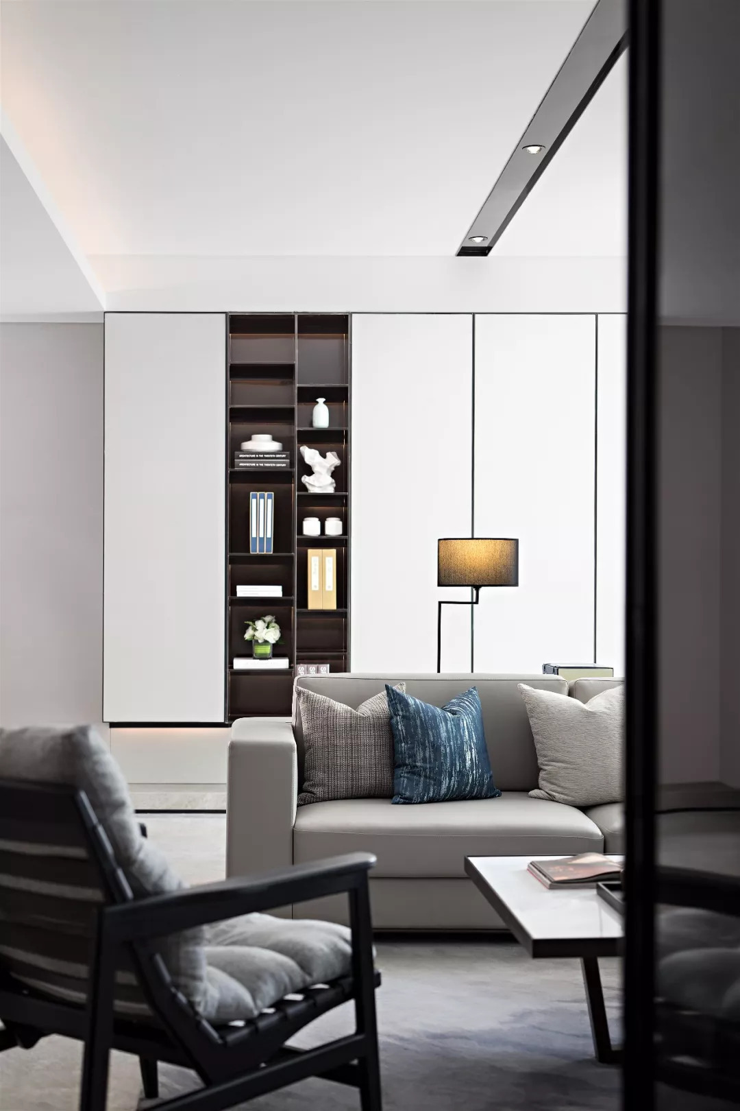 “下疊設計不以雍容華貴取勝,旨在以現代人的審美需求來打造東方韻味。空間以米、灰色為主,線條與塊面獨立又相近,融于整體結構和氣質,局部跳躍藍色氤氳出寧靜感,同時也將新東方之美引至更深的境地。”設計師方磊說道。