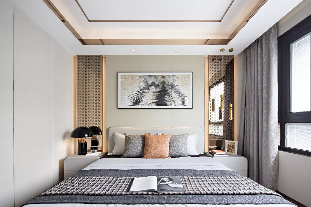 主臥延續餐廳的設計手法,古銅與皮革互補共生。金屬沖孔板、畫飾、以及搭毯紋理相呼應,加以橘色、綠色的跳躍點綴,強調空間細節的同時,也帶來時尚感。