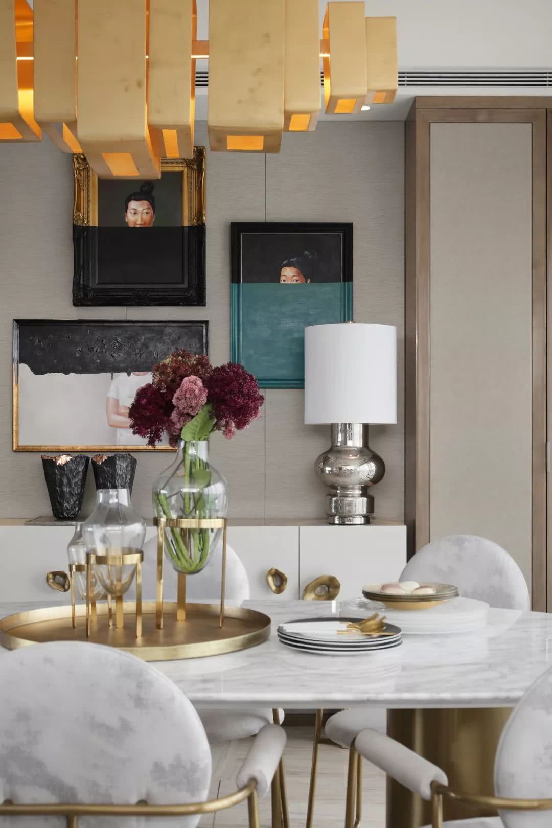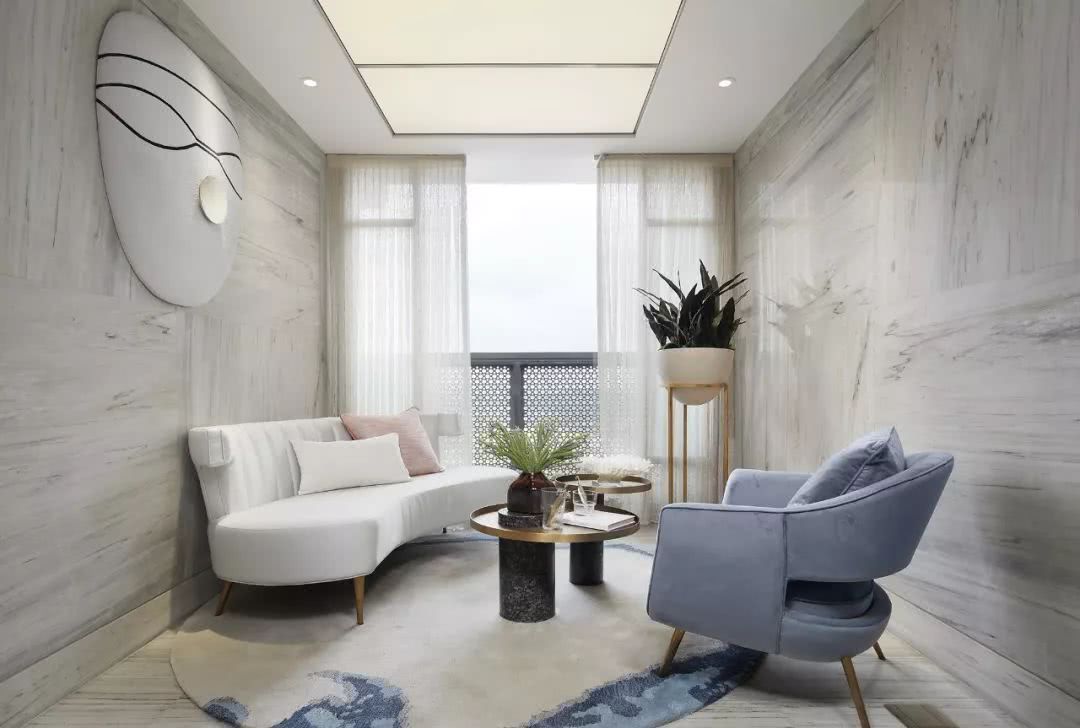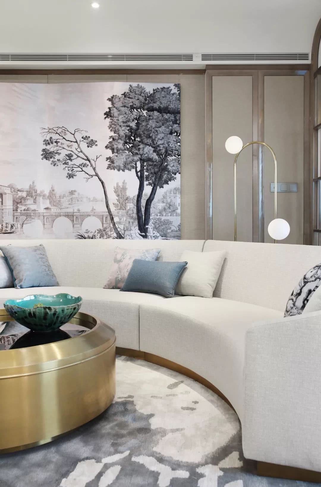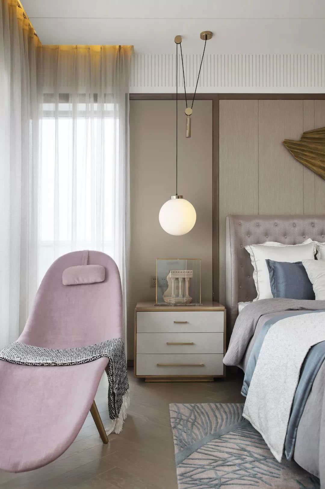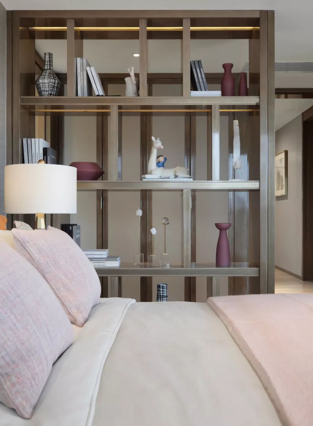 初見,客廳米灰的墻面和白色的沙發(fā)讓空間顯得舒適而寧靜,在視覺上撫平了金屬配飾帶來的森冷感。深灰色的電視機背景墻在空間中,讓空間顯得沉穩(wěn)而大氣,而一抹抹巧妙的金色總不經意的映入眼底,整體不顯沉悶而富有質感。設計師汲取水能容納百川的胸廓,將水靜謐的顏色融入方案之中,水波狀暈染的地毯、間隔的抱枕以及點綴的窗簾,都以高雅的青藍色為主,營造出優(yōu)雅不纖弱低調但奢華的氛圍。餐廳整個空間較為狹長,我們在餐廳區(qū)域選用橢圓形與曲線元素較多的餐桌椅,利用家具來降低視覺拉伸感。同時將西廚和餐廳結合,在空間上大大增加了實用性的同時也讓視覺更加開闊。主臥設計中,極致的展現了“柔美”。我們使用了淺色和中性色為主的家具,讓整個空間充滿了溫馨和舒適的感覺。不同的空間,有不同的生活訴求。客房風格迥異,一間簡潔,一間添加新中式元素,不做多余的加法。