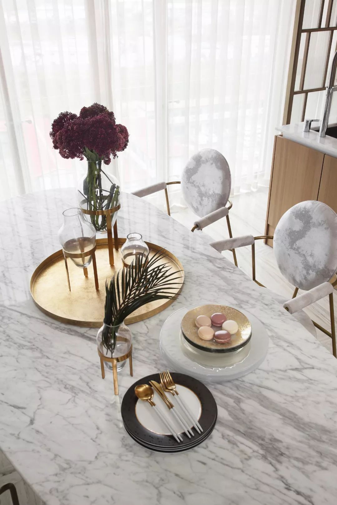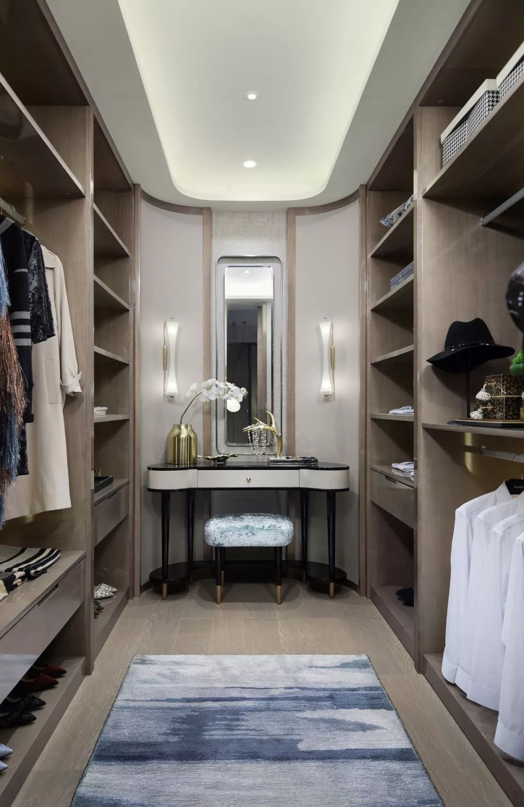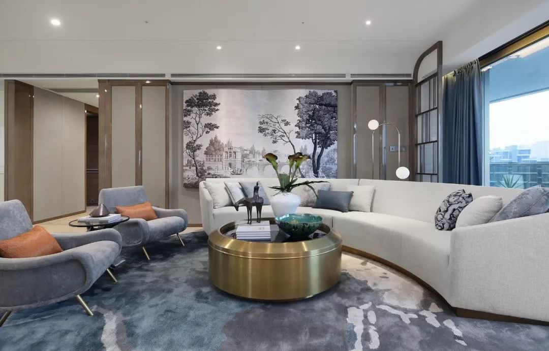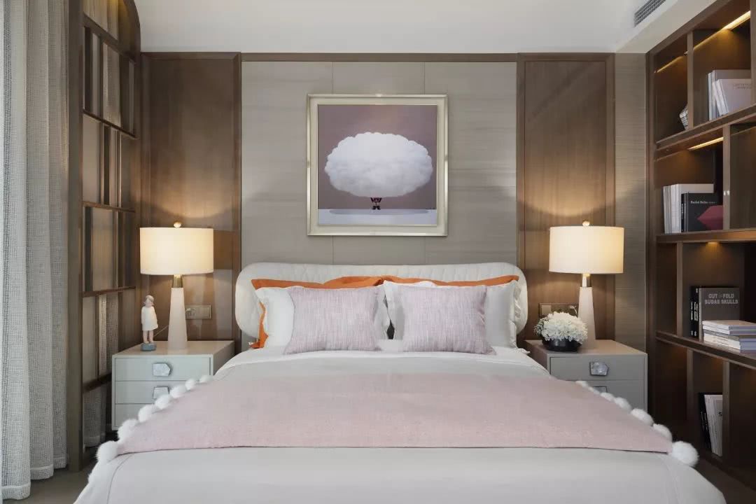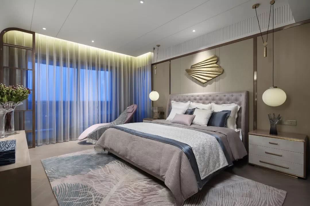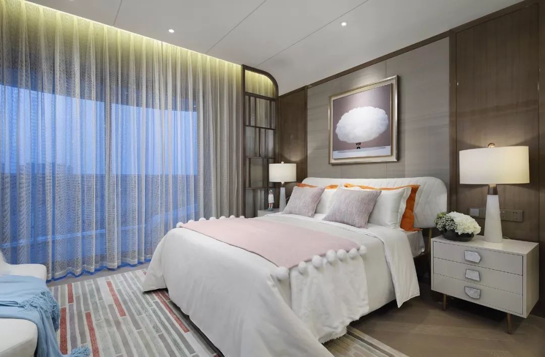 初見,客廳米灰的墻面和白色的沙發(fā)讓空間顯得舒適而寧靜,在視覺上撫平了金屬配飾帶來的森冷感。深灰色的電視機背景墻在空間中,讓空間顯得沉穩(wěn)而大氣,而一抹抹巧妙的金色總不經意的映入眼底,整體不顯沉悶而富有質感。設計師汲取水能容納百川的胸廓,將水靜謐的顏色融入方案之中,水波狀暈染的地毯、間隔的抱枕以及點綴的窗簾,都以高雅的青藍色為主,營造出優(yōu)雅不纖弱低調但奢華的氛圍。餐廳整個空間較為狹長,我們在餐廳區(qū)域選用橢圓形與曲線元素較多的餐桌椅,利用家具來降低視覺拉伸感。同時將西廚和餐廳結合,在空間上大大增加了實用性的同時也讓視覺更加開闊。主臥設計中,極致的展現了“柔美”。我們使用了淺色和中性色為主的家具,讓整個空間充滿了溫馨和舒適的感覺。不同的空間,有不同的生活訴求。客房風格迥異,一間簡潔,一間添加新中式元素,不做多余的加法。