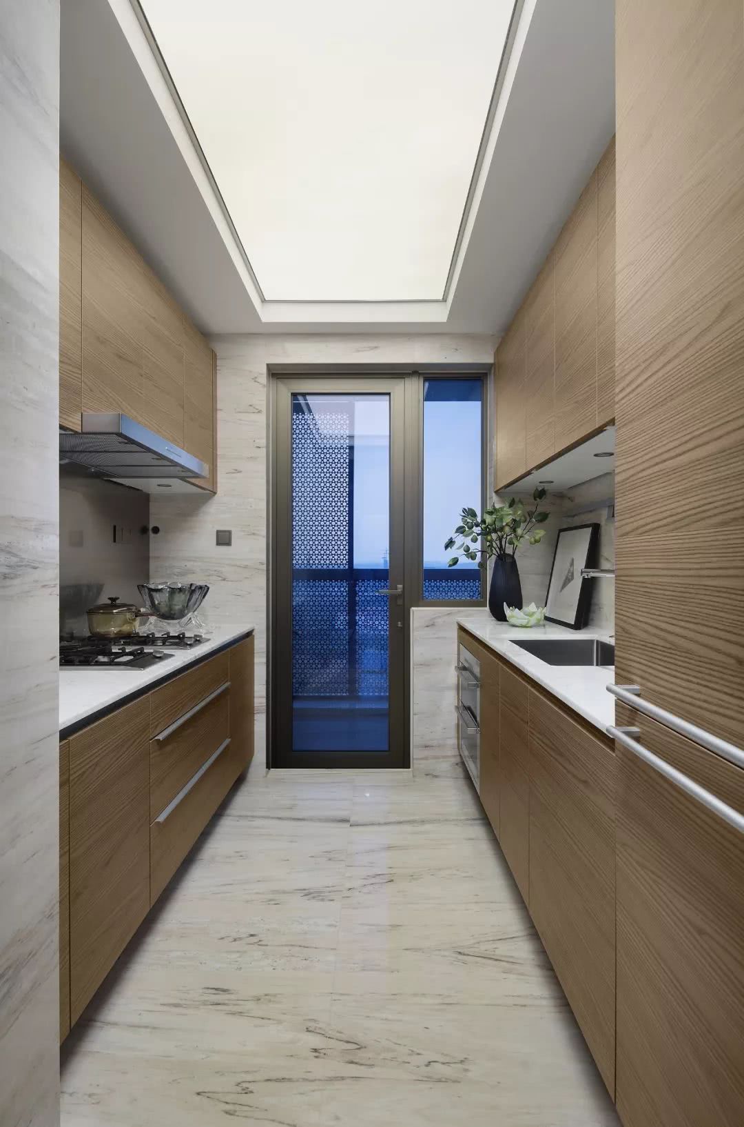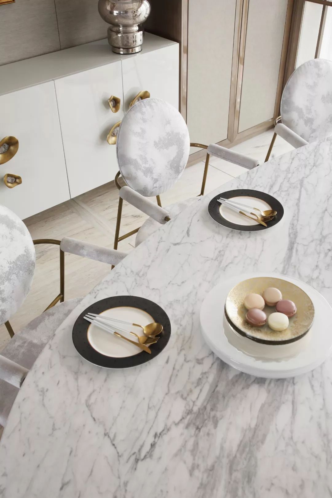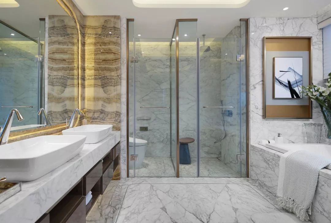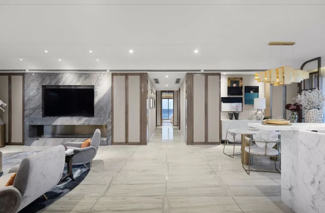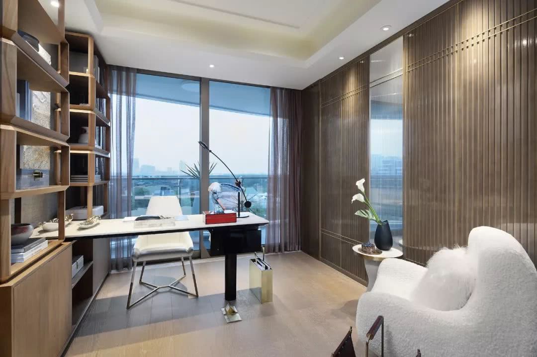 初見,客廳米灰的墻面和白色的沙發(fā)讓空間顯得舒適而寧靜,在視覺上撫平了金屬配飾帶來的森冷感。深灰色的電視機背景墻在空間中,讓空間顯得沉穩(wěn)而大氣,而一抹抹巧妙的金色總不經意的映入眼底,整體不顯沉悶而富有質感。設計師汲取水能容納百川的胸廓,將水靜謐的顏色融入方案之中,水波狀暈染的地毯、間隔的抱枕以及點綴的窗簾,都以高雅的青藍色為主,營造出優(yōu)雅不纖弱低調但奢華的氛圍。餐廳整個空間較為狹長,我們在餐廳區(qū)域選用橢圓形與曲線元素較多的餐桌椅,利用家具來降低視覺拉伸感。同時將西廚和餐廳結合,在空間上大大增加了實用性的同時也讓視覺更加開闊。主臥設計中,極致的展現了“柔美”。我們使用了淺色和中性色為主的家具,讓整個空間充滿了溫馨和舒適的感覺。不同的空間,有不同的生活訴求。客房風格迥異,一間簡潔,一間添加新中式元素,不做多余的加法。