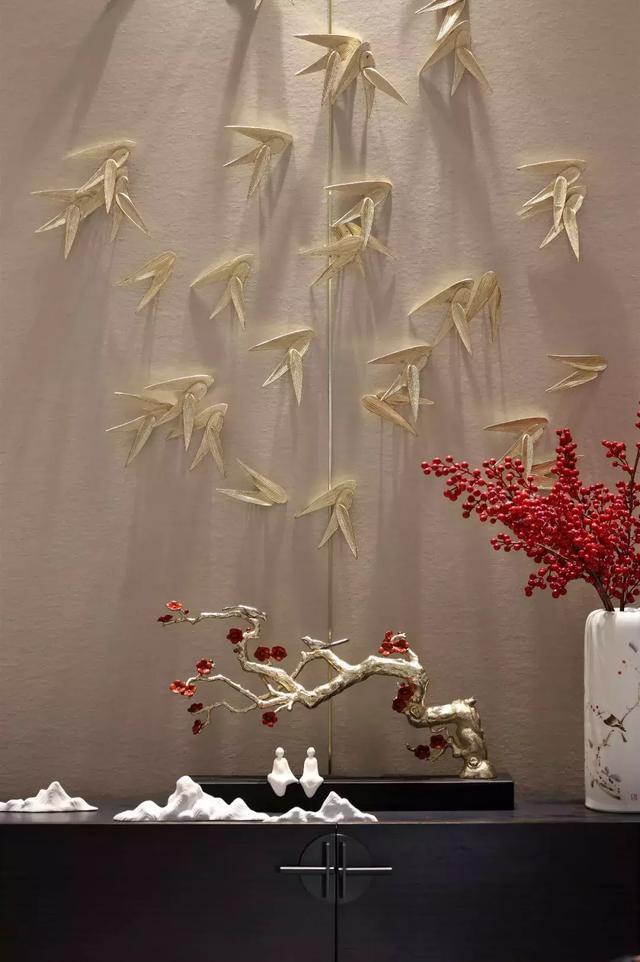 本案采用淺木色為主色調(diào),打破傳統(tǒng)濃郁色彩風(fēng),又不缺乏中國風(fēng)韻味。紅色點綴使得空間活潑,素色窗紗+中式掛畫使空間空靈而寫意。